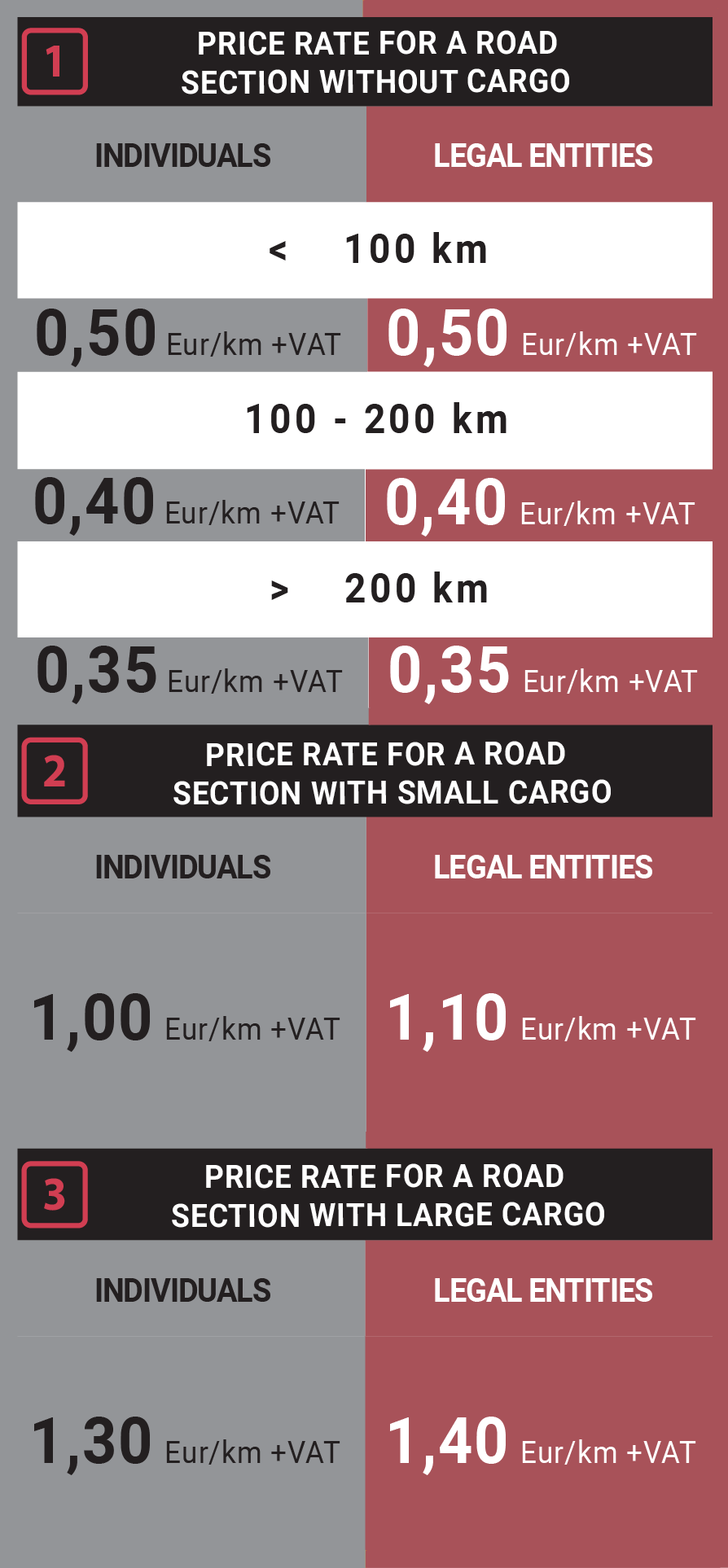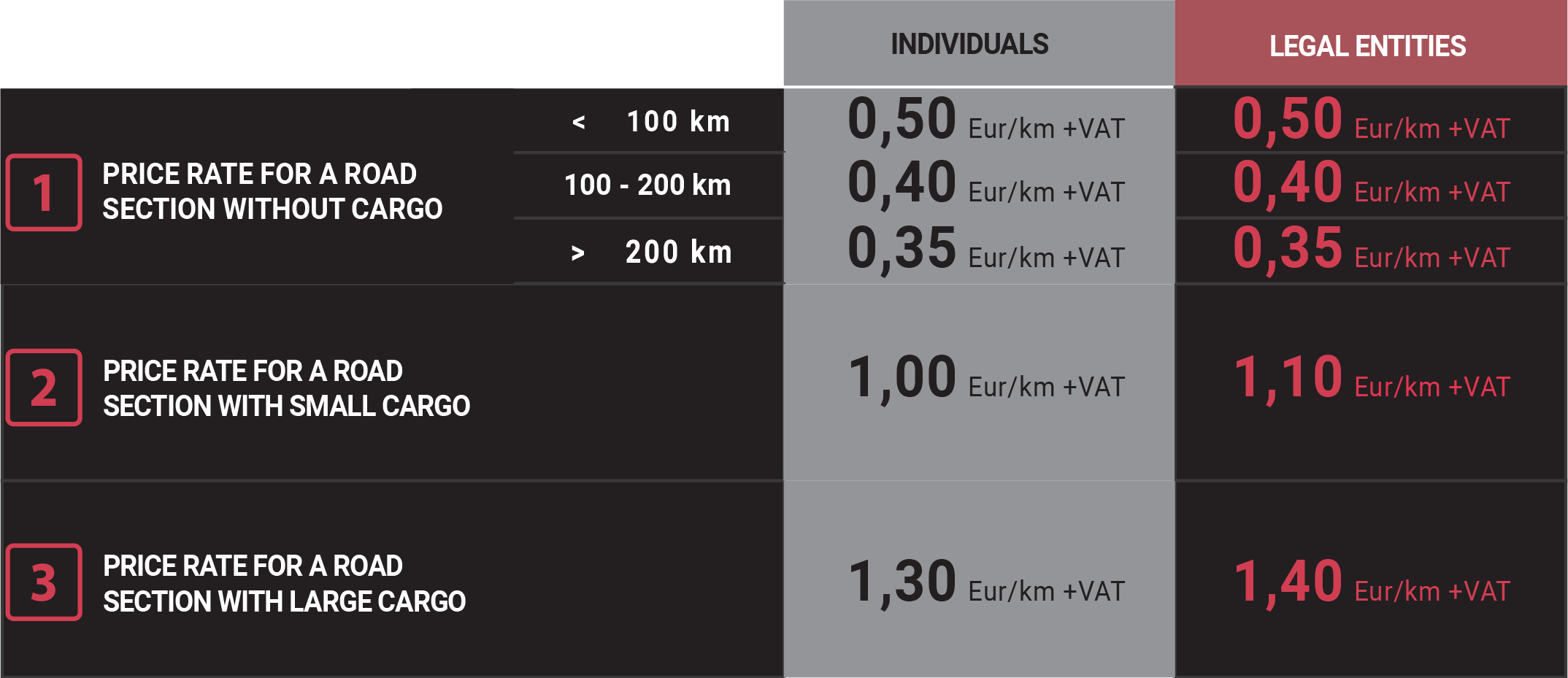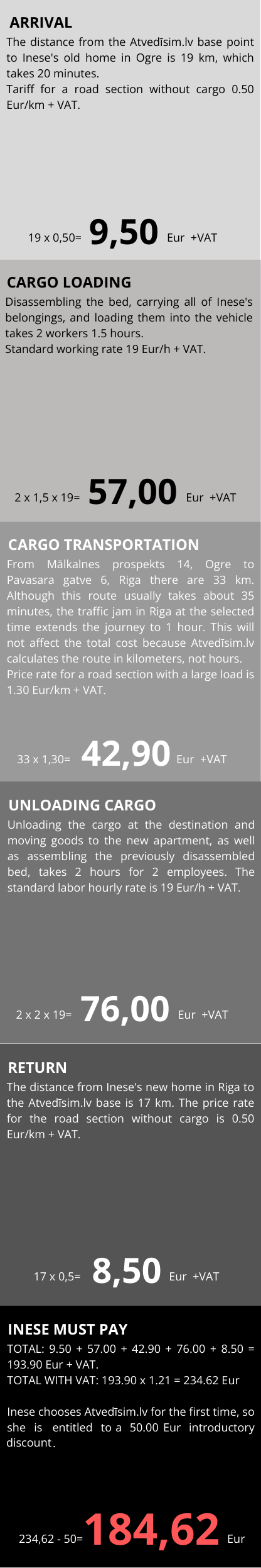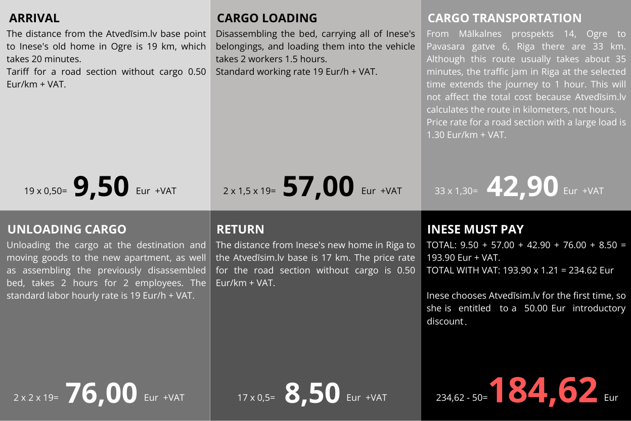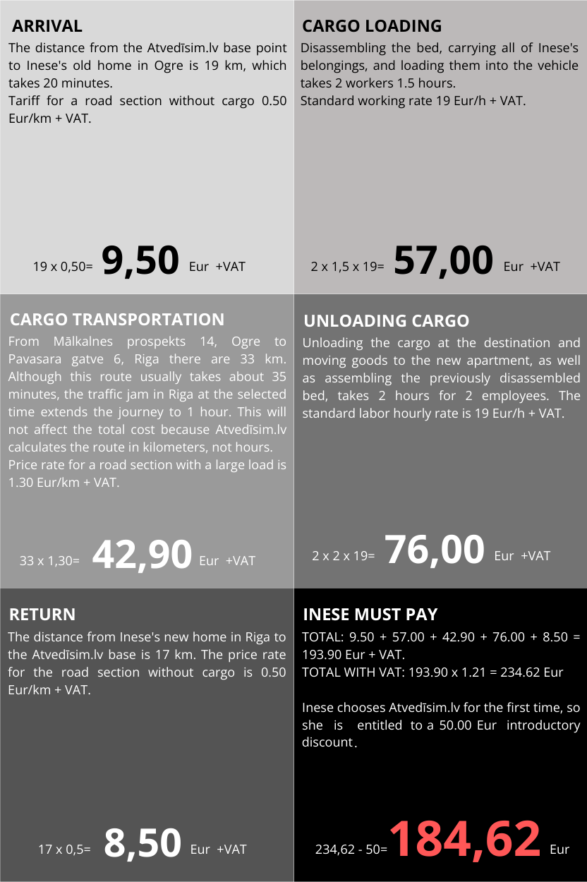 The final transportation cost is determined only after specifying a specific departure and destination address and a route calculation performed by Atvedīsim.lv. The unilateral calculation of the price by the client according to the specified price rates can only be indicative. All costs are agreed with the client before the service is provided.