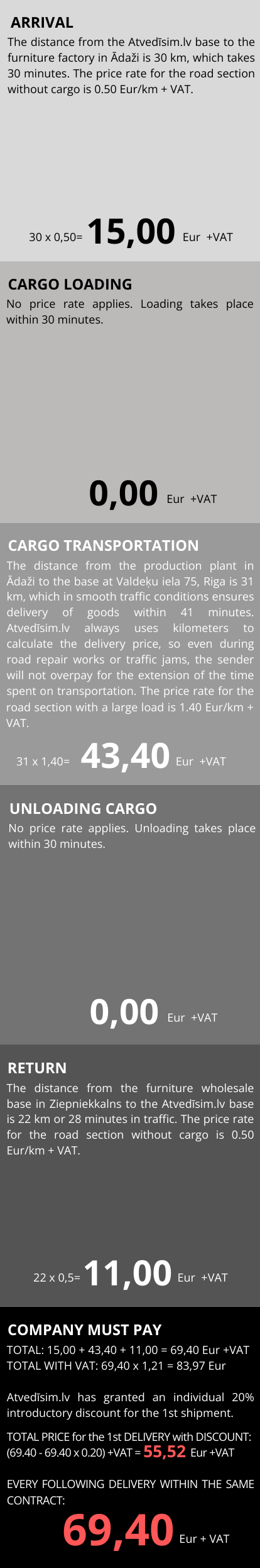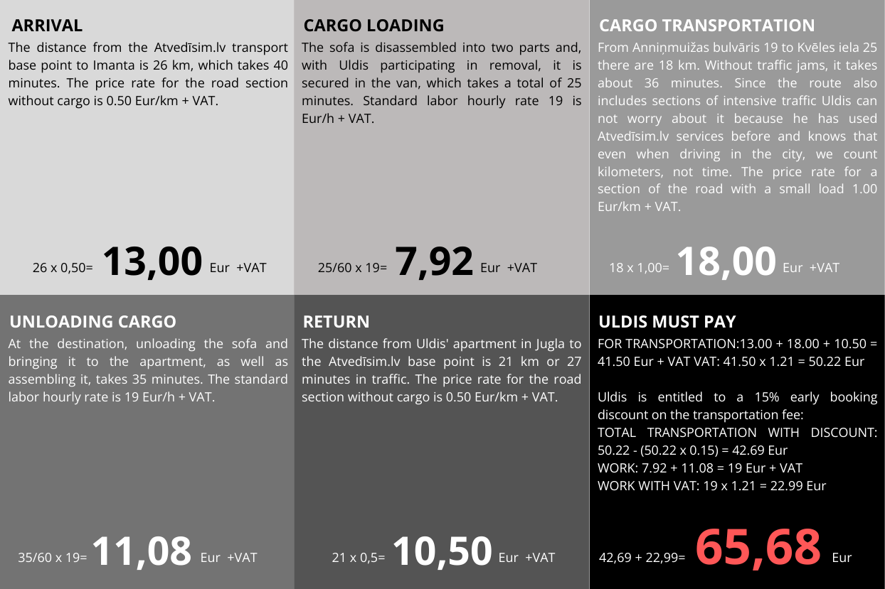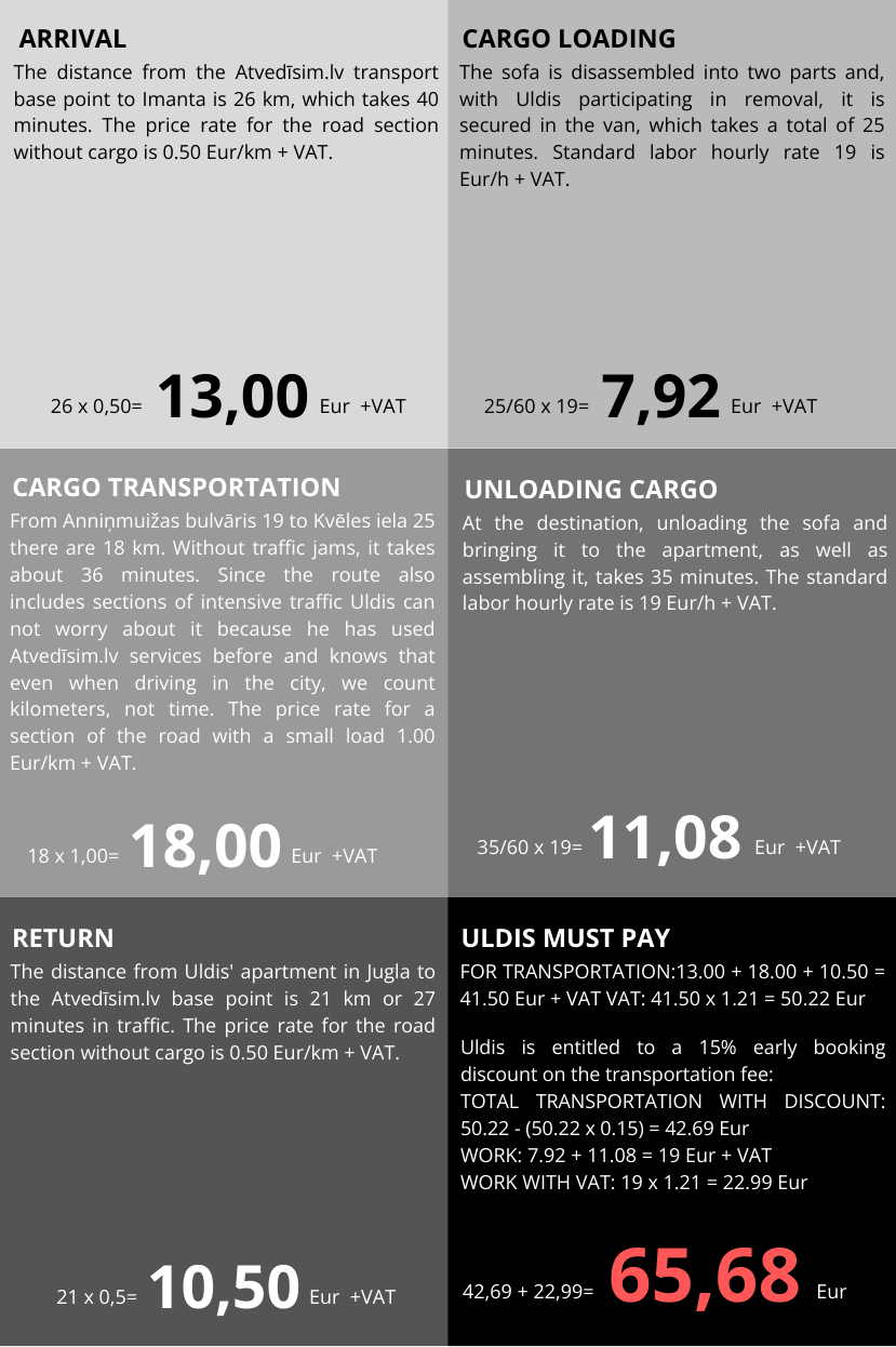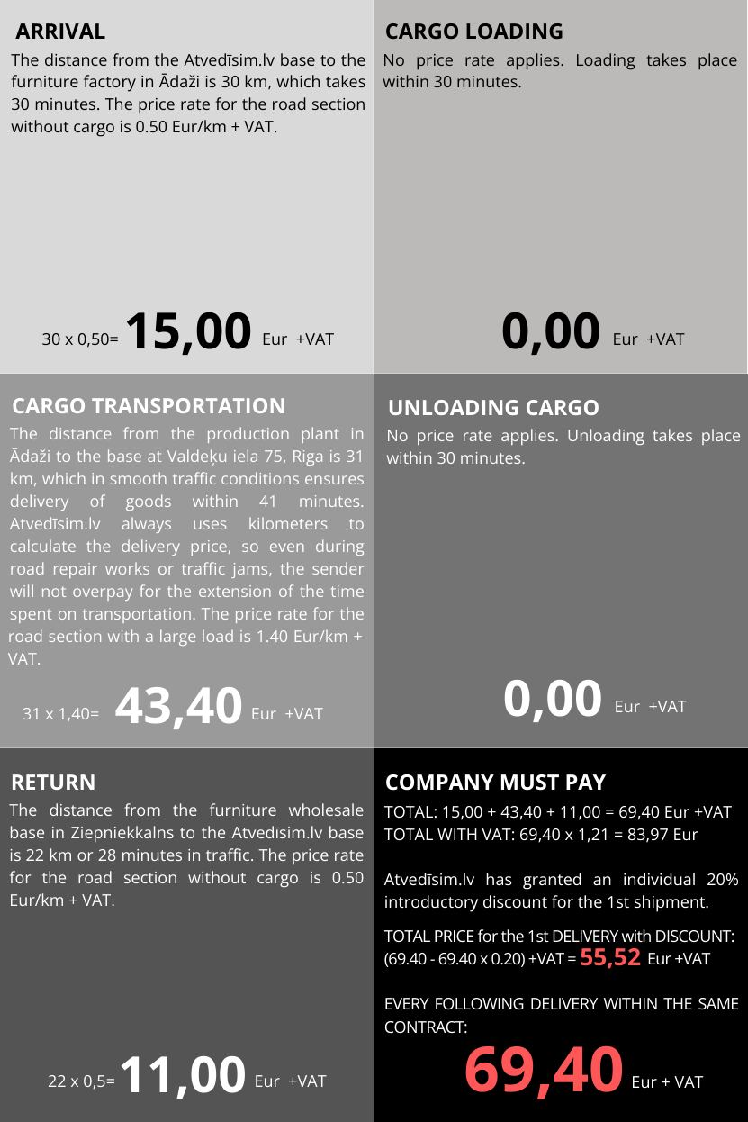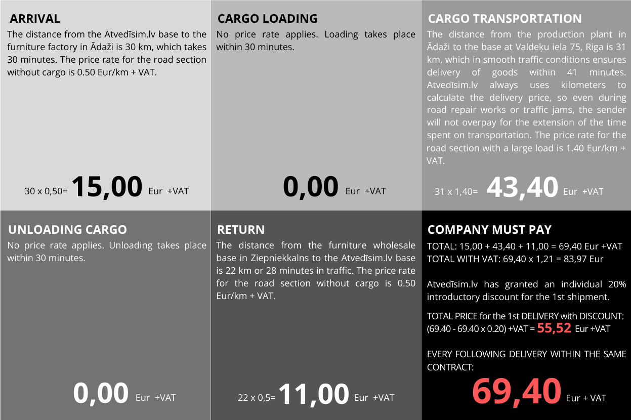 The transportation fee calculation includes: transportation, fuel, Latvian road toll (vignette). Special entry or parking fees, if required, may be charged separately. Distance is calculated from the moment Atvedīsim.lv vehicle leaves the base location (Rīgas iela 24, Salaspils) until it returns to the base location.