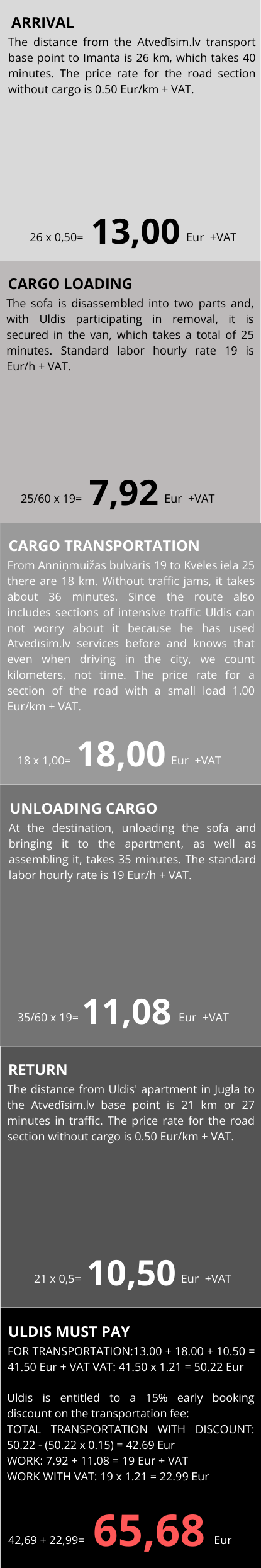 With Atvedīsim.lv you will never overpay for things that are beyond your control, such as delays in delivery due to traffic jams or road repairs. That is why we separate transportation costs from labor costs and set a fixed transportation price before starting work.