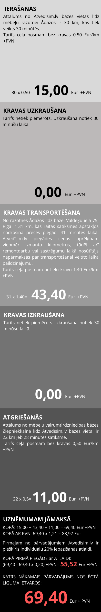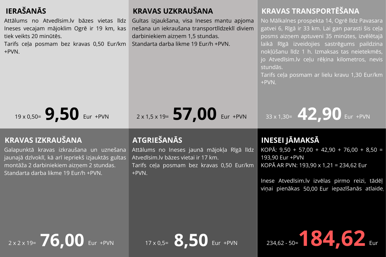 ietilpst: transportēšana, degviela, Latvijas autoceļu lietošanas nodeva (vinjete). Speciāla iebraukšanas vai parkošanās maksa, ja tāda nepieciešama, var tikt iekasēta atsevišķi. Kilometrāža tiek skaitīta, Atvedīsim.lv transportlīdzeklim izbraucot no bāzes vietas (Rīgas iela 24, Salaspils) līdz brīdim, kad tas atgriežas bāzes vietā.