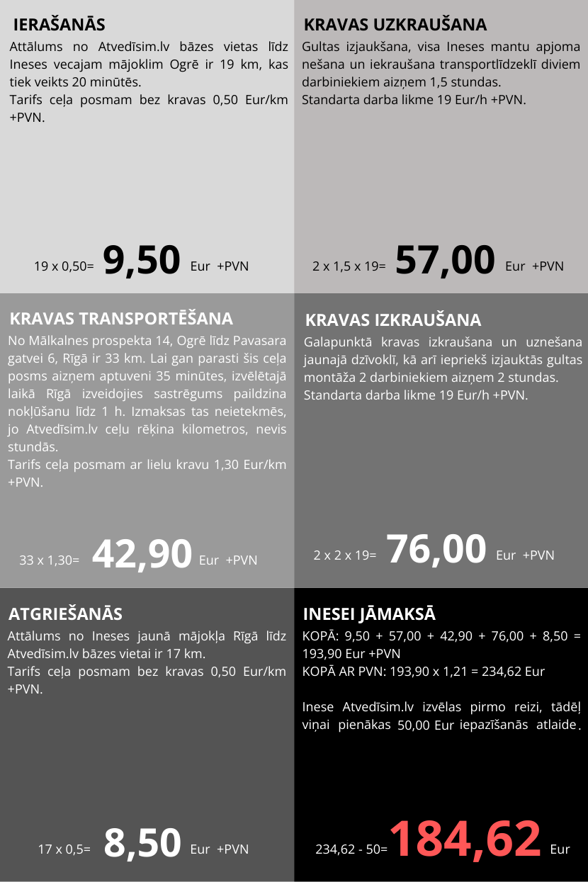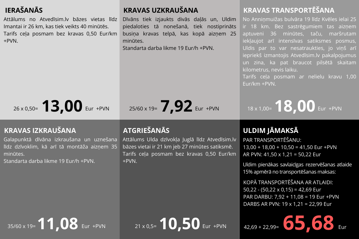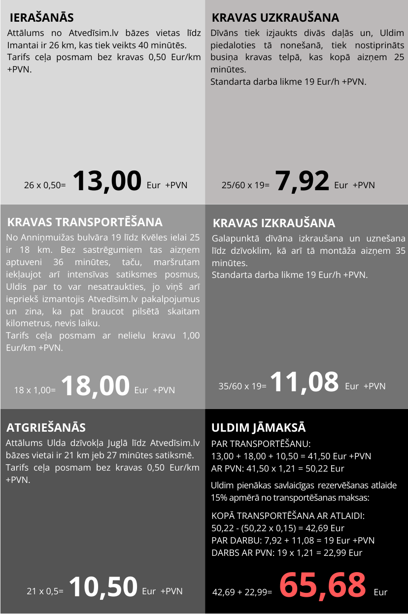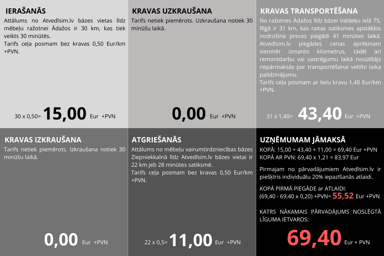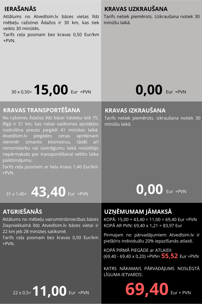Ar Atvedīsim.lv Tu nekad nepārmaksāsi par to, kas nav atkarīgas no Tevis, piemēram, par sastrēguma vai ceļa remontdarbu izraisīto piegādes paildzinājumu. Tieši tāpēc nodalām transportēšanas izmaksas no darba izmaksām un nosakām fiksētu transportēšanas cenu pirms darba uzsākšanas.