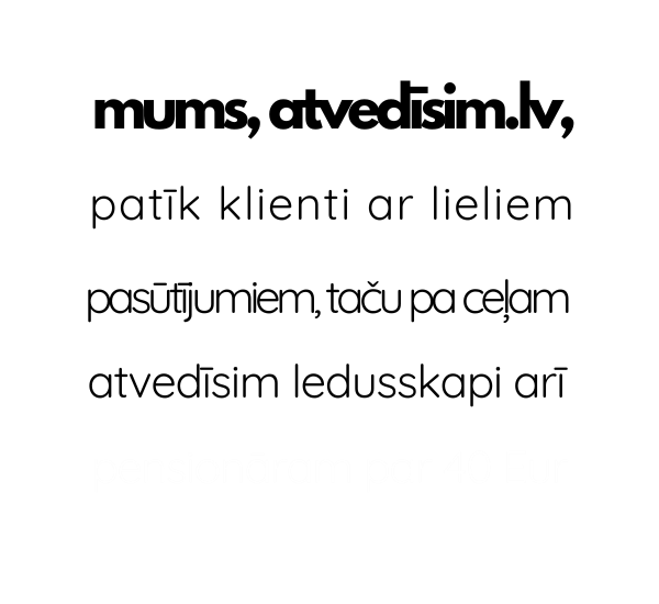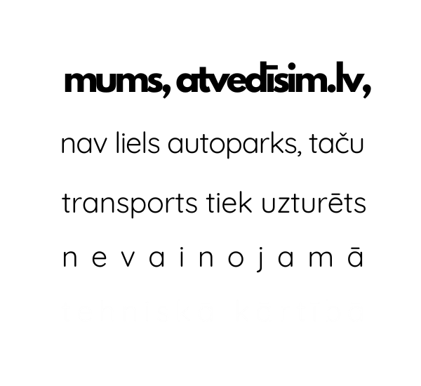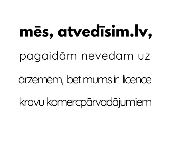 Мы просто хотели сказать: в Atvedisim.lv мы знаем, что можем вам предложить, и честно признаём, чего не можем. Мы понимаем ценность нашей работы и подхода.Доверив нам ваш груз, вы сможете ближе познакомиться с нами, а мы с вами или вашей компанией. У вас будет возможность оценить наше сотрудничество. Мы искренне считаем, что перед выбором нас вы должны также изучить и сравнить другие интересные предложения.Почему? Потому что вы имеете полное право быть на 100% уверенным в своём решении, выбирая Atvedisim.lv.Познакомимся?